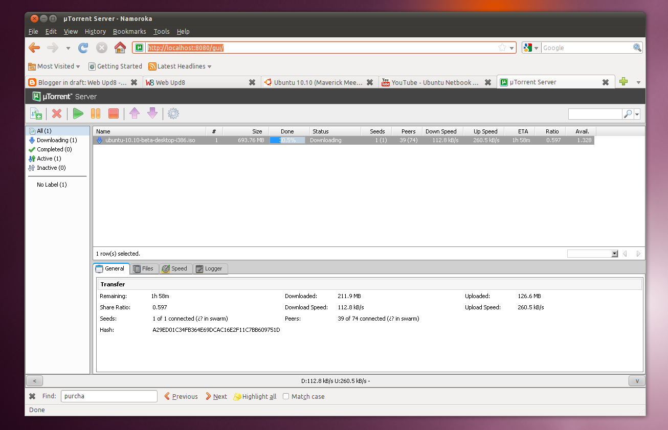 You're probably wondering how to tweak settings like the port, the folder where you download the bittorrent files and so on. All the settings are stored in a file called "utserver.conf" which you must created in the uTorrent server folder you've just downloaded. Read the documentation which you can find in the "docs" folder - open the "uTorrent_Server.html" file in a browser.
