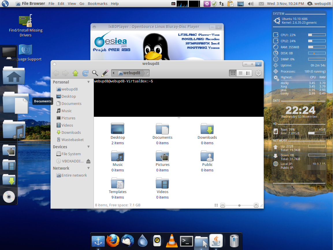 Except the changes mentioned above, there are only a few other minor tweaks so the rest of the default applications are the same as in Pinguy 10.04: 2 Docky instances running by default, Nauilus Elementary, Cover Thumbnailer, IMDB Thumbnailer, Conky (Colors), Gloobus Preview, Cover Gloobus, Gnome Activity Journal (with Zeitgeist), VLC, Rapid Photo Downloader, Ailurus, Ubuntu Tweak, Bleachbit, Open Shot, GDM2Setup, MintMenu, Thunderbird instead of Evolution, Skype and the list can go on - all updated to their latest versions.